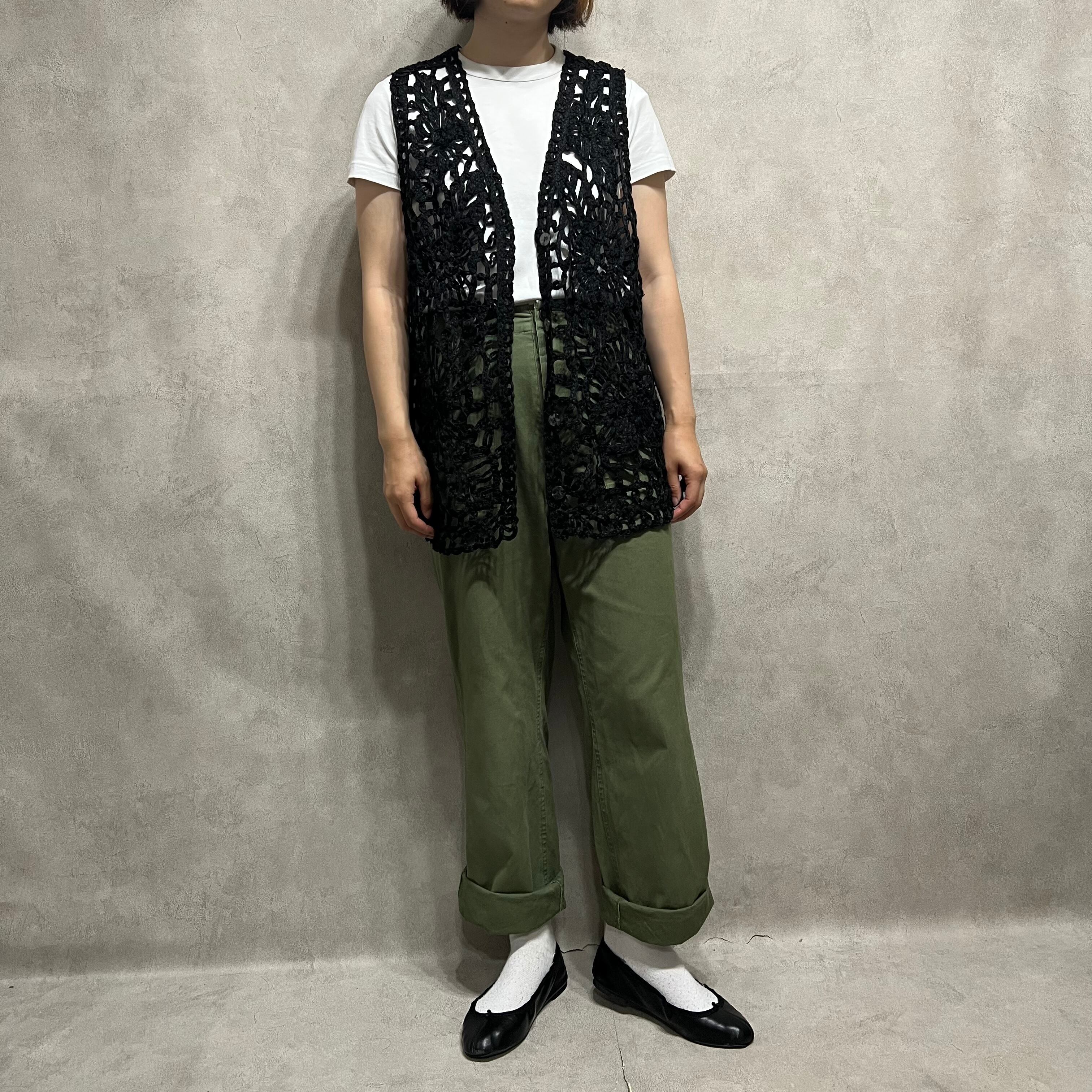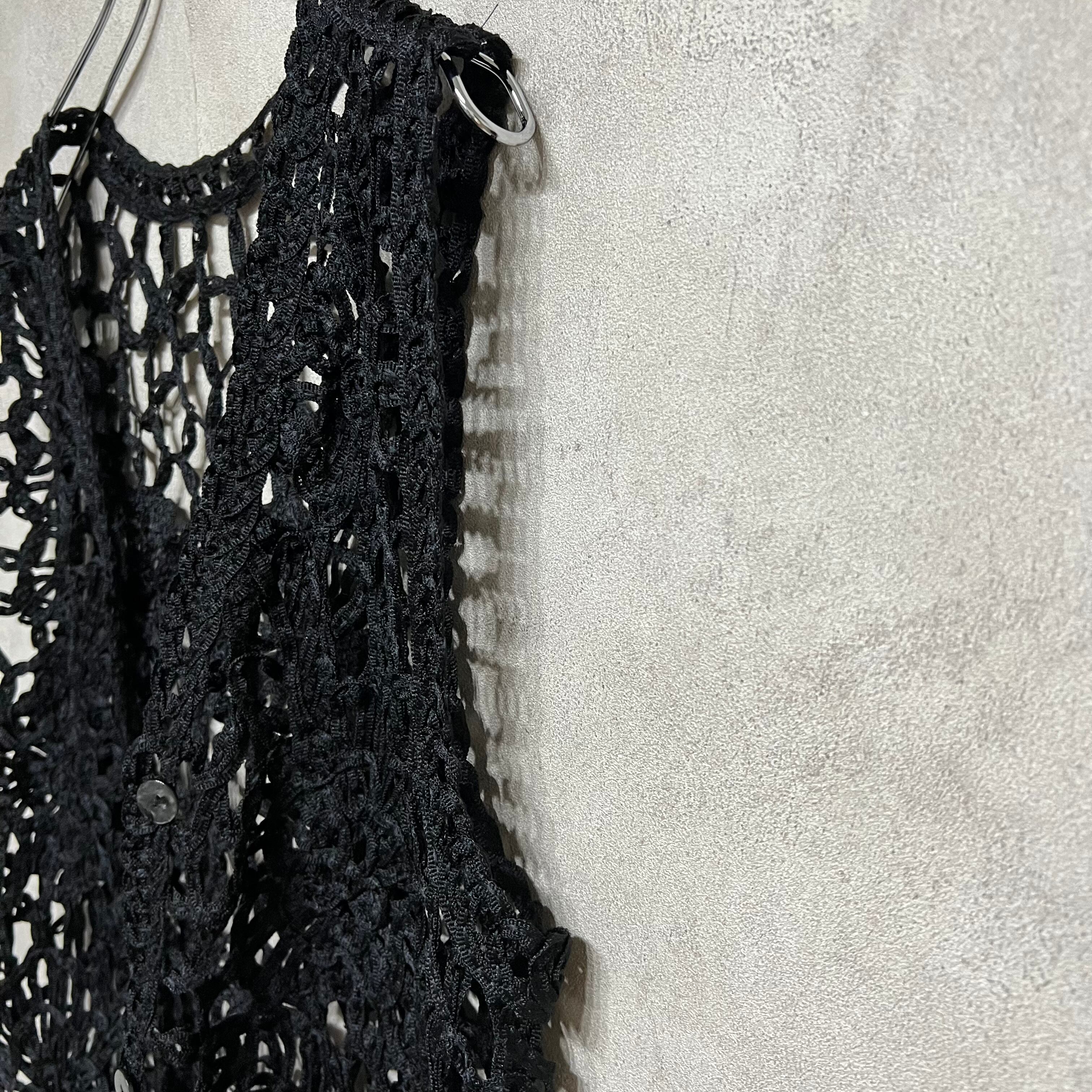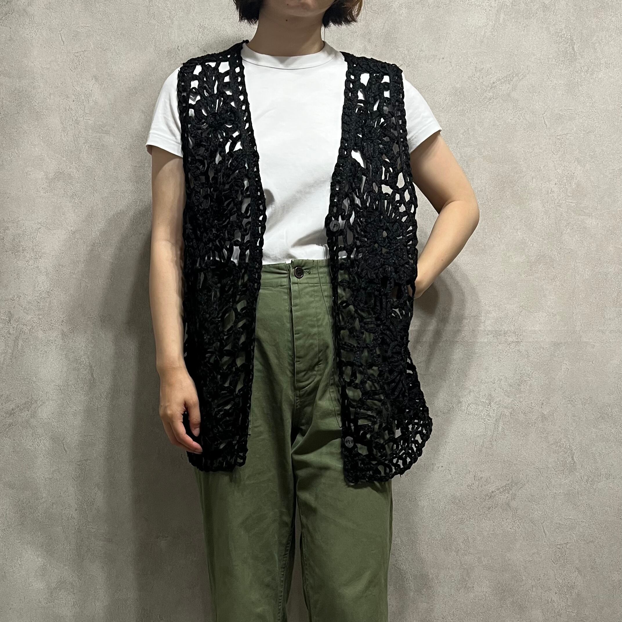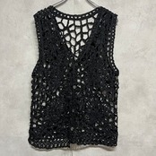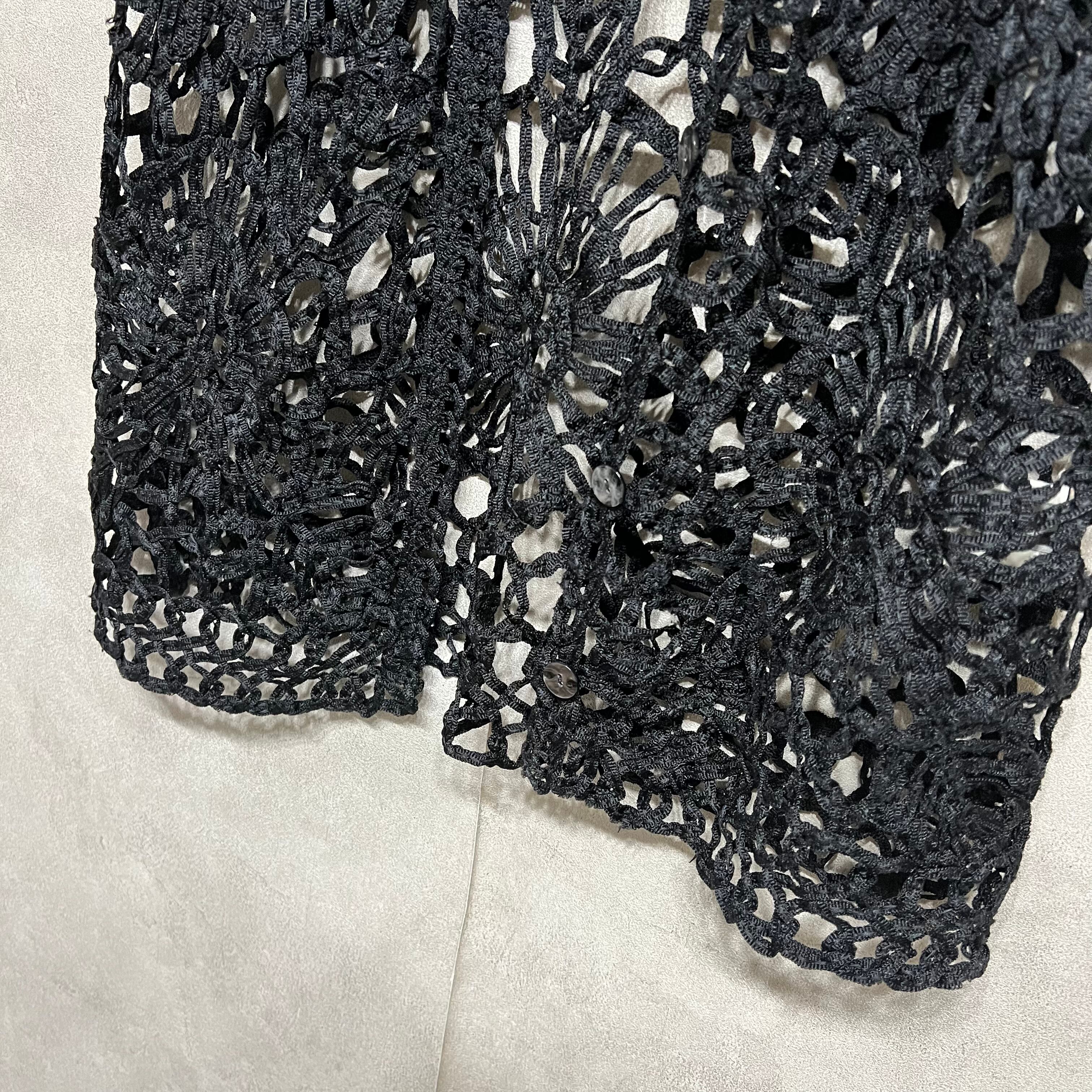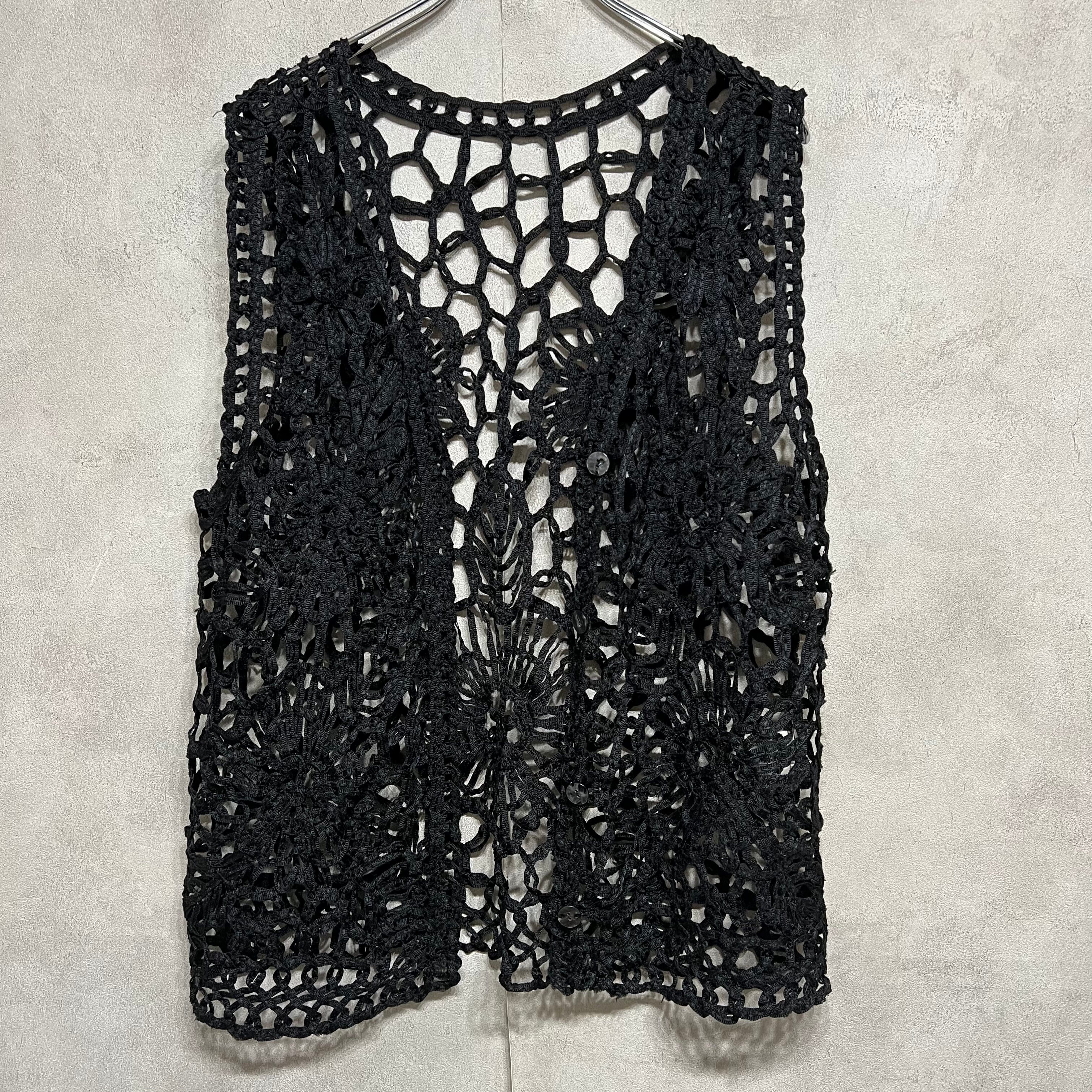 vintage 花柄レース編みベスト ブラック 黒 Vネック 前開き 古着 レディース