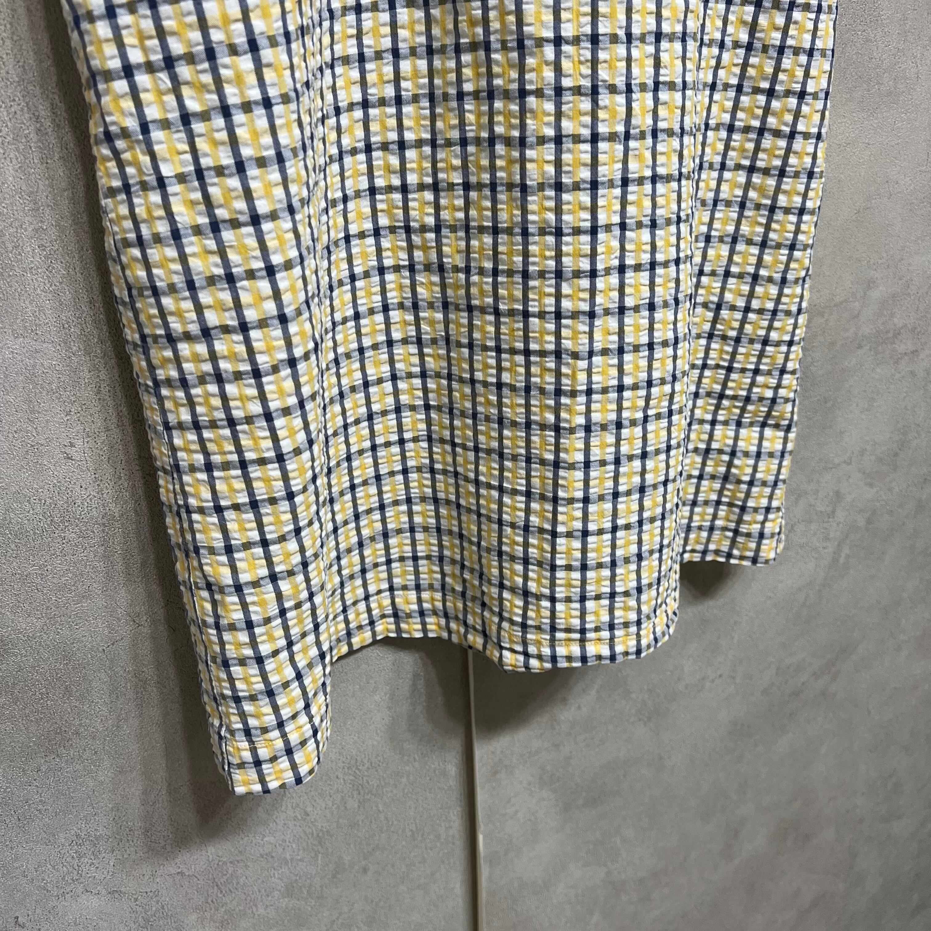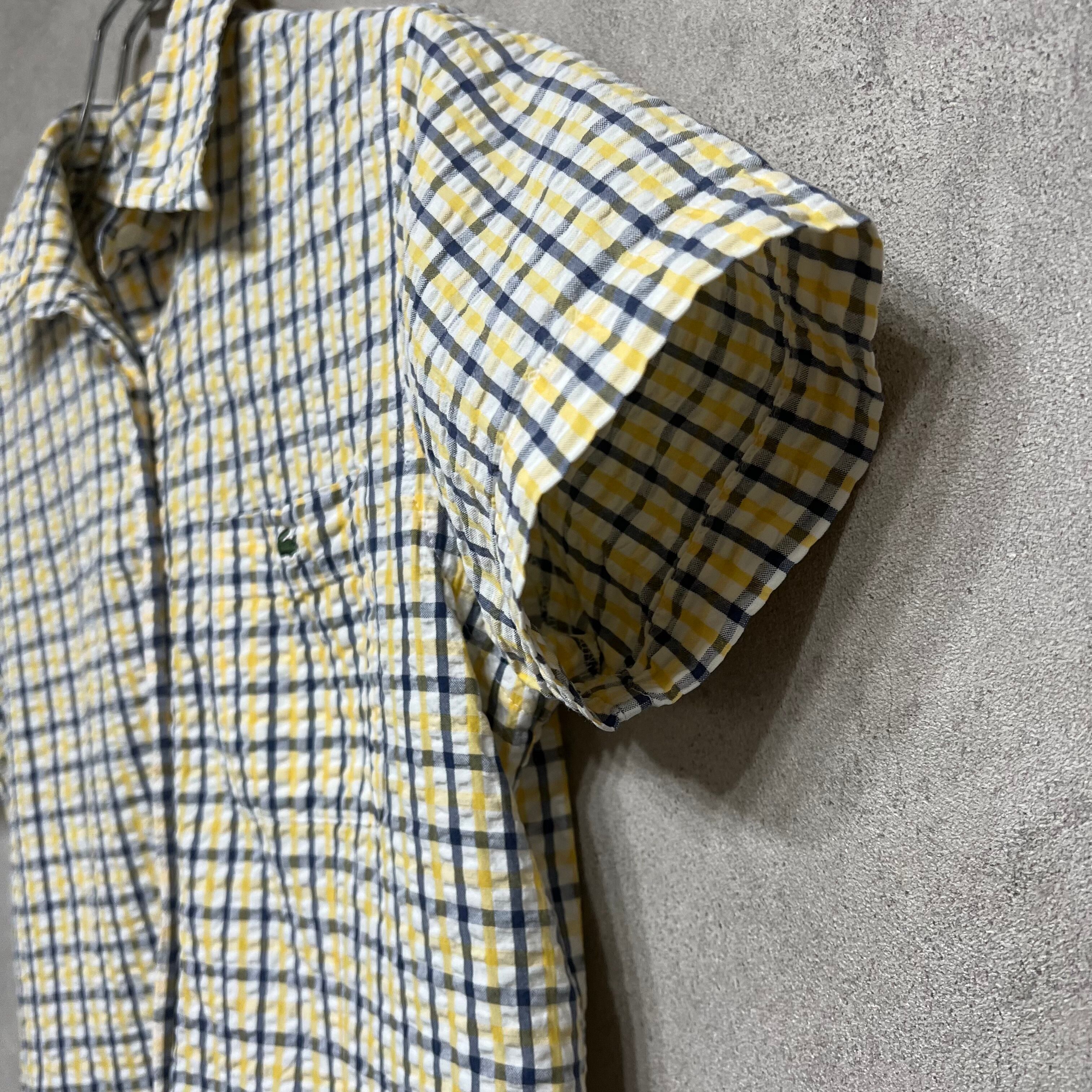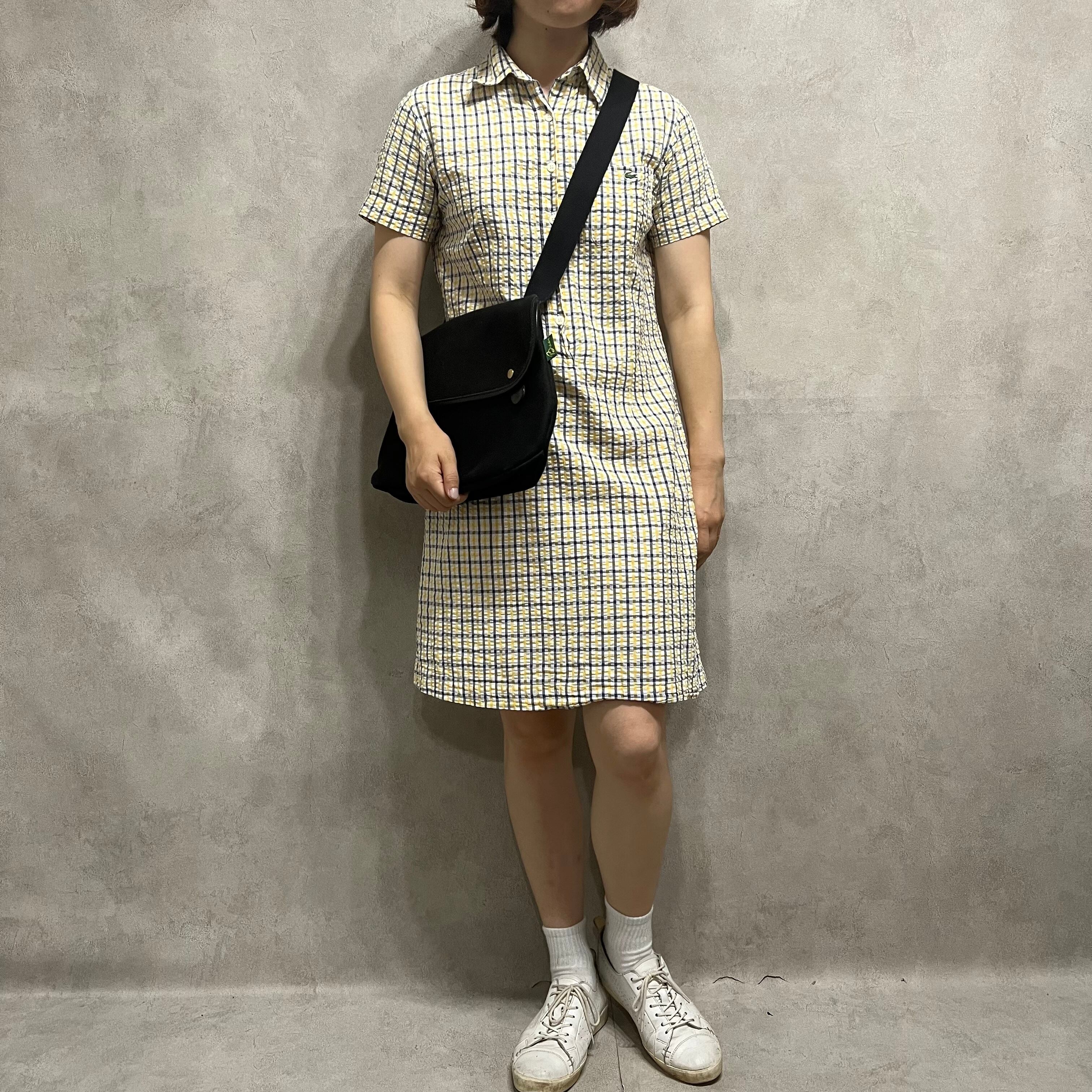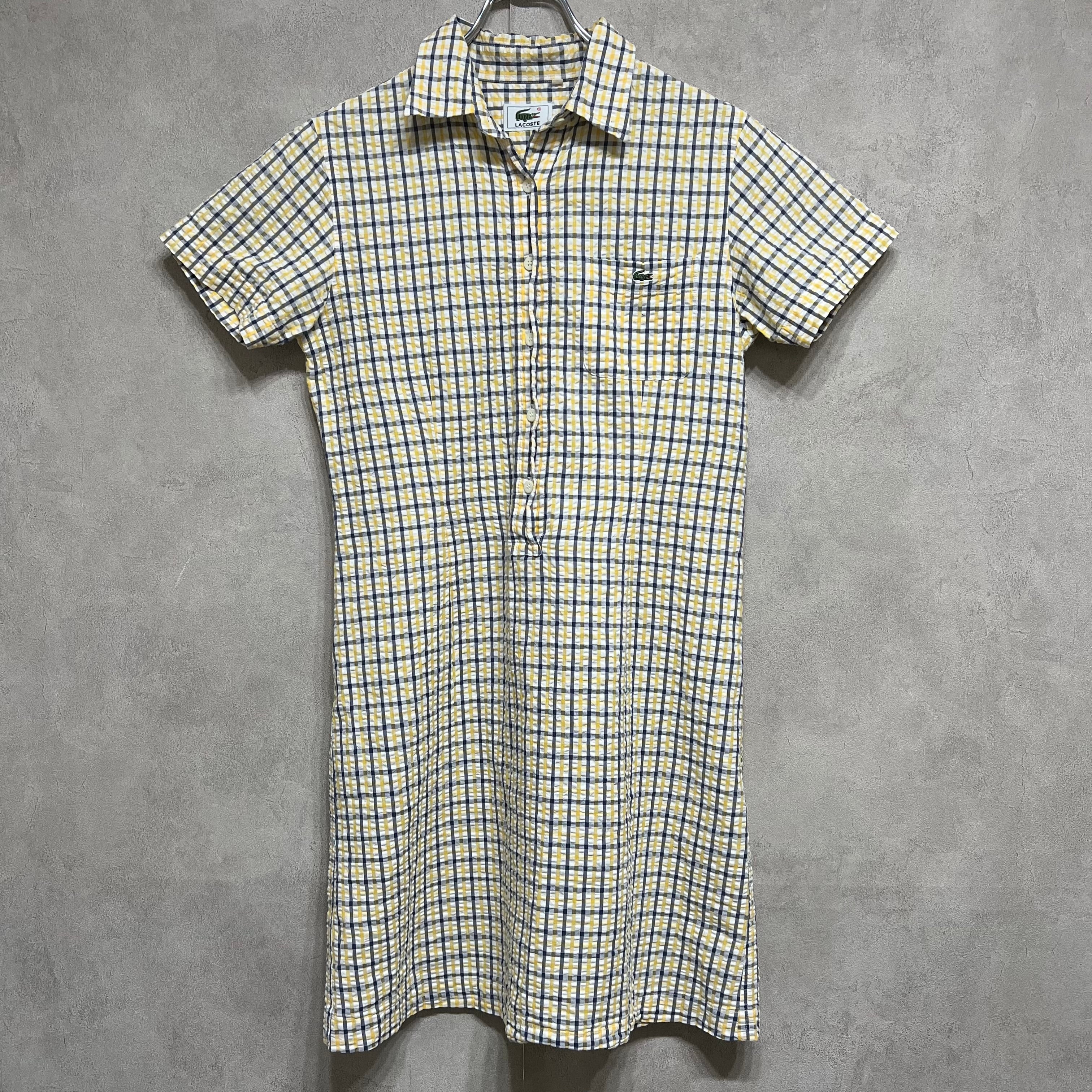 日本製 LACOSTE シアサッカーチェック柄ワンピース イエロー 半袖 ラコステ 90s 80s vintage 古着 レディース