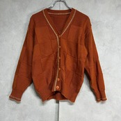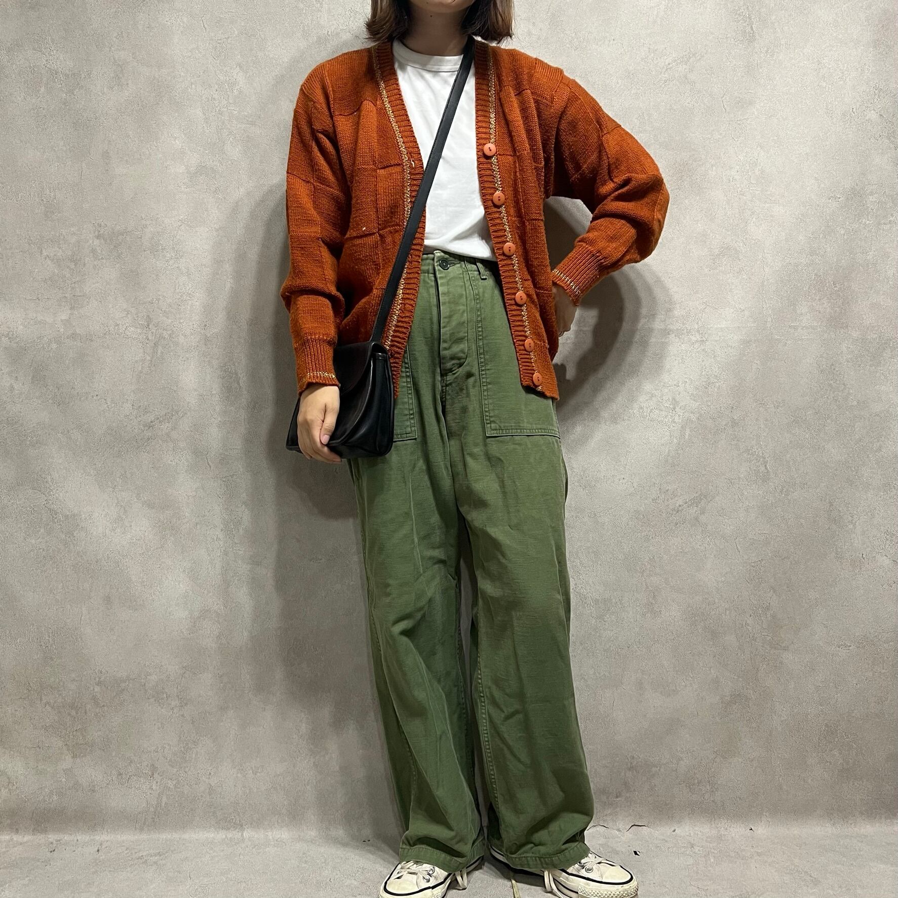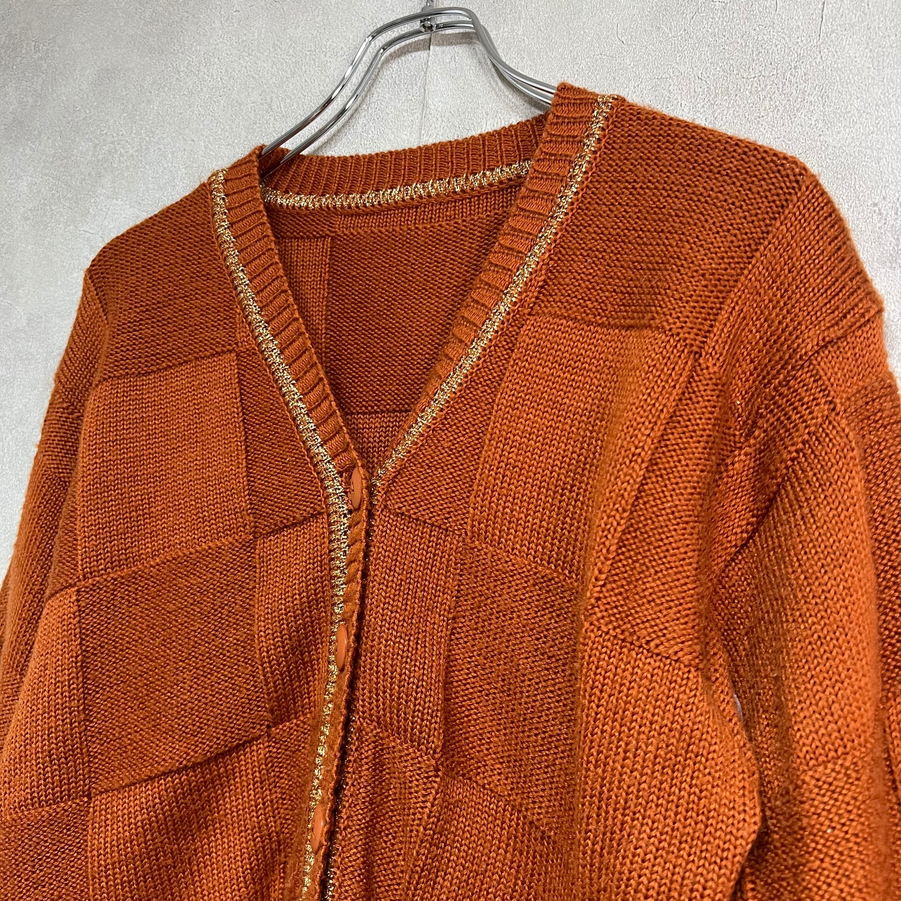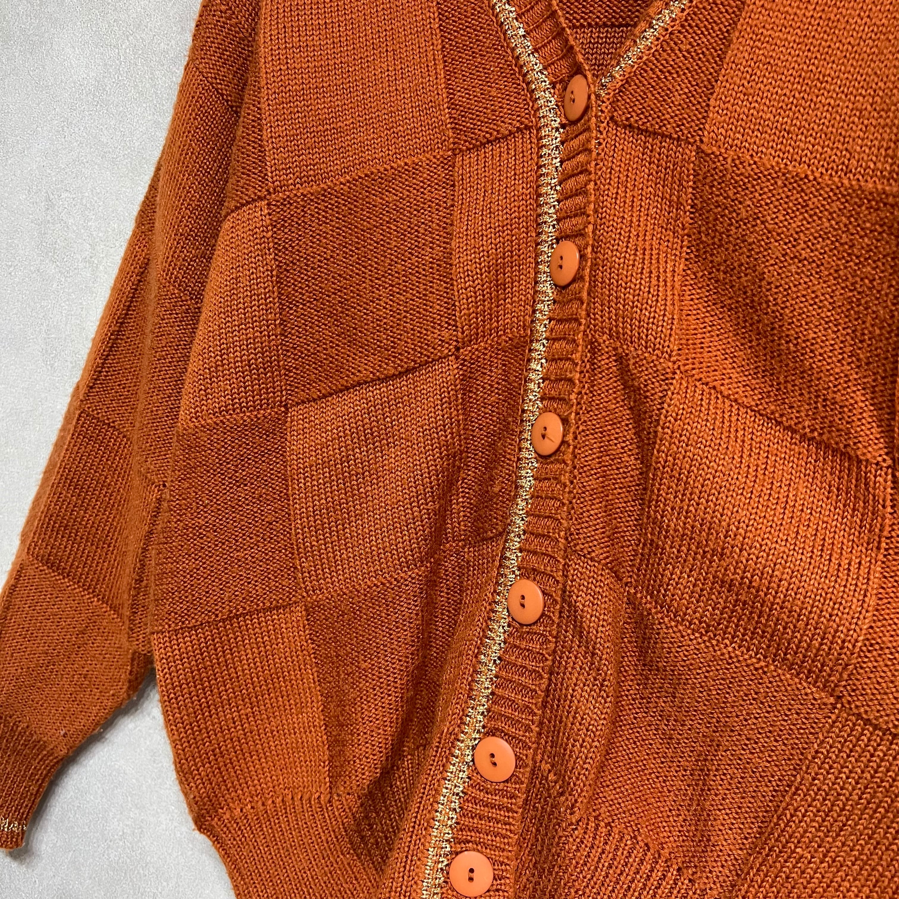 vintage イントレチャート柄ビッグボタンカーディガン オレンジ 日本製 秋冬 ウール オーバーサイズ 古着 レディース プチプラ
