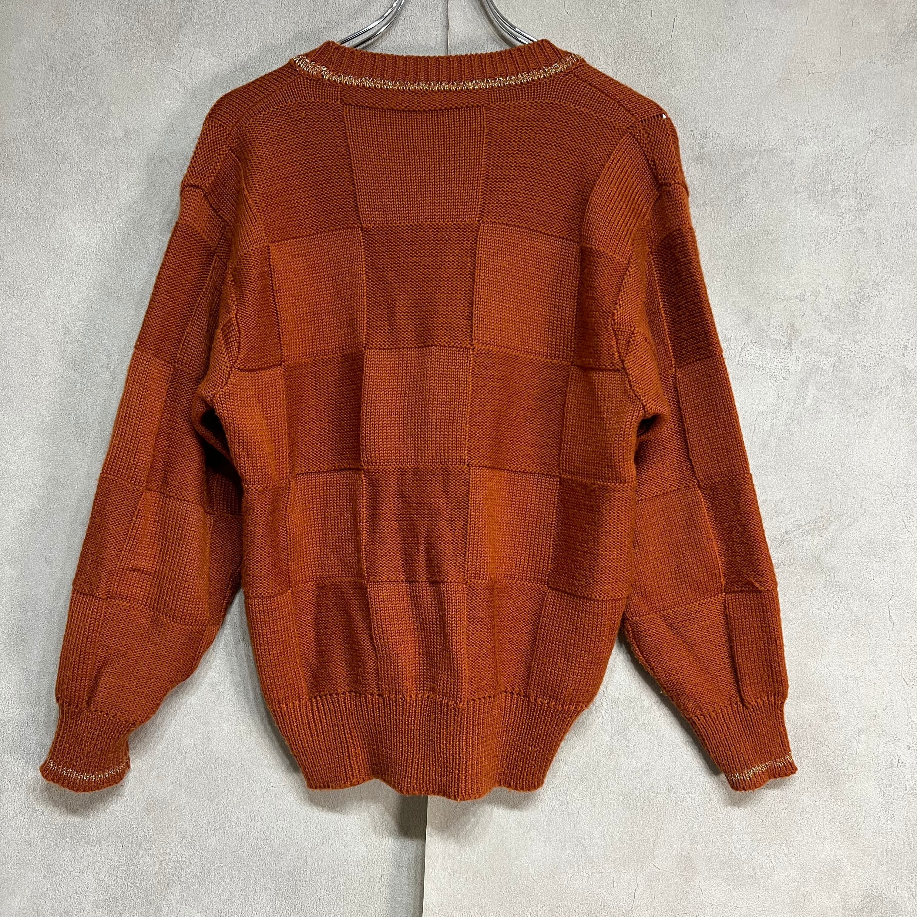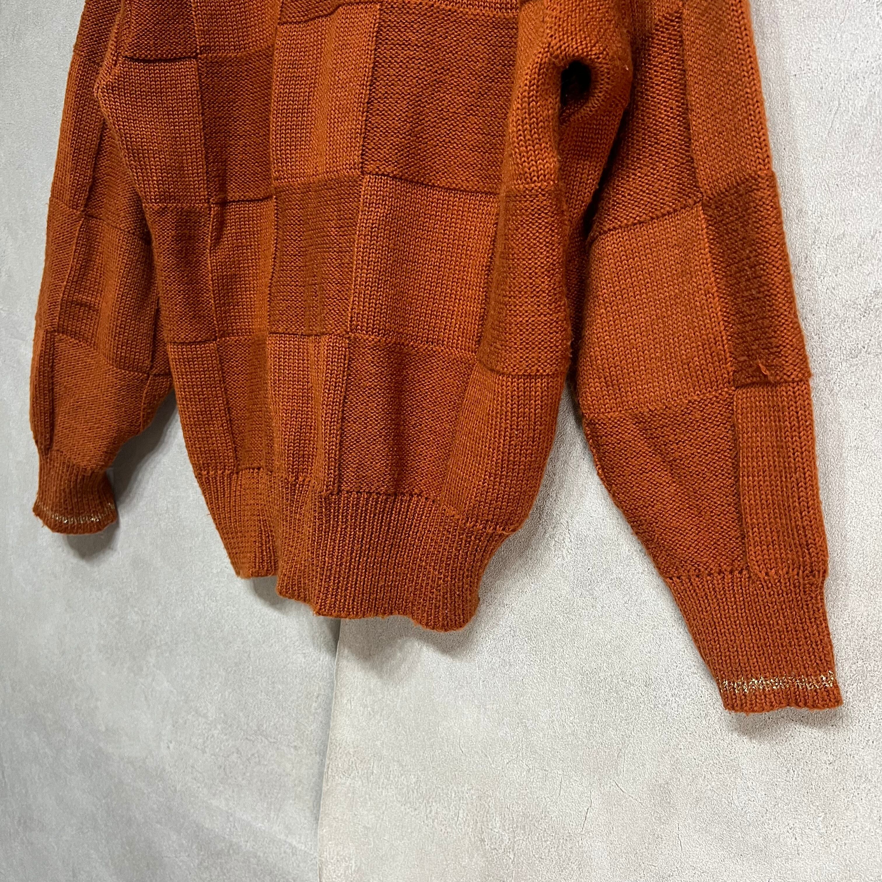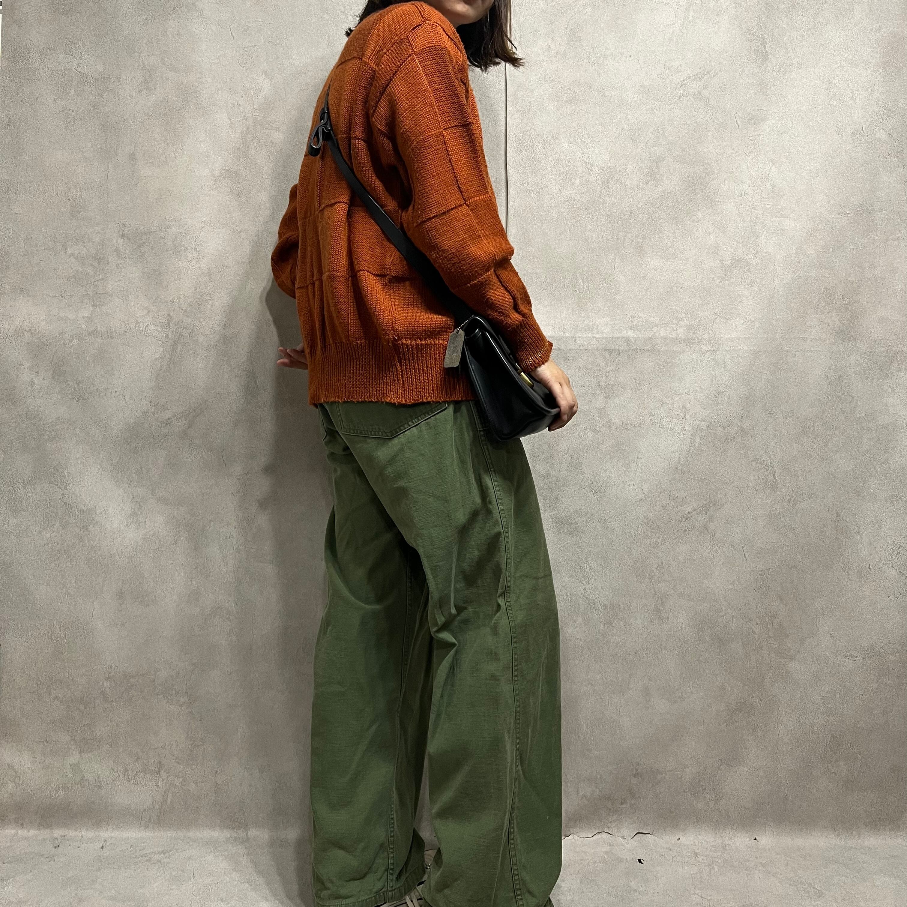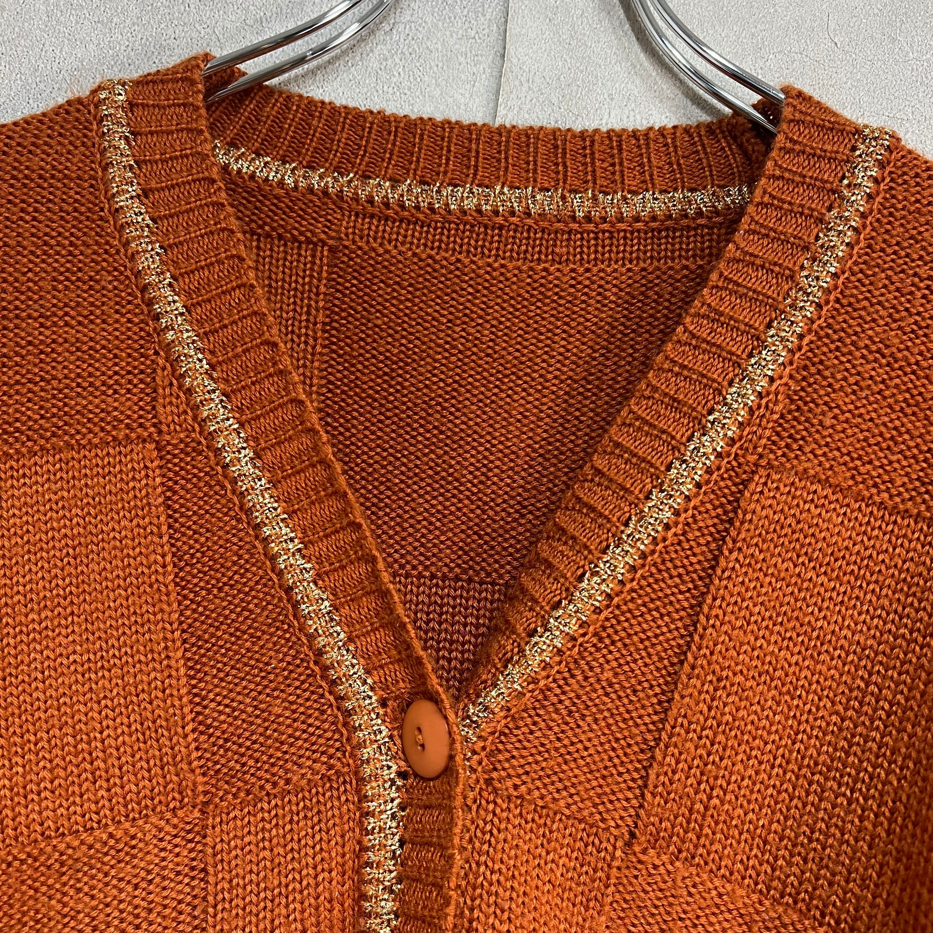 vintage イントレチャート柄ビッグボタンカーディガン オレンジ 日本製 秋冬 ウール オーバーサイズ 古着 レディース プチプラ