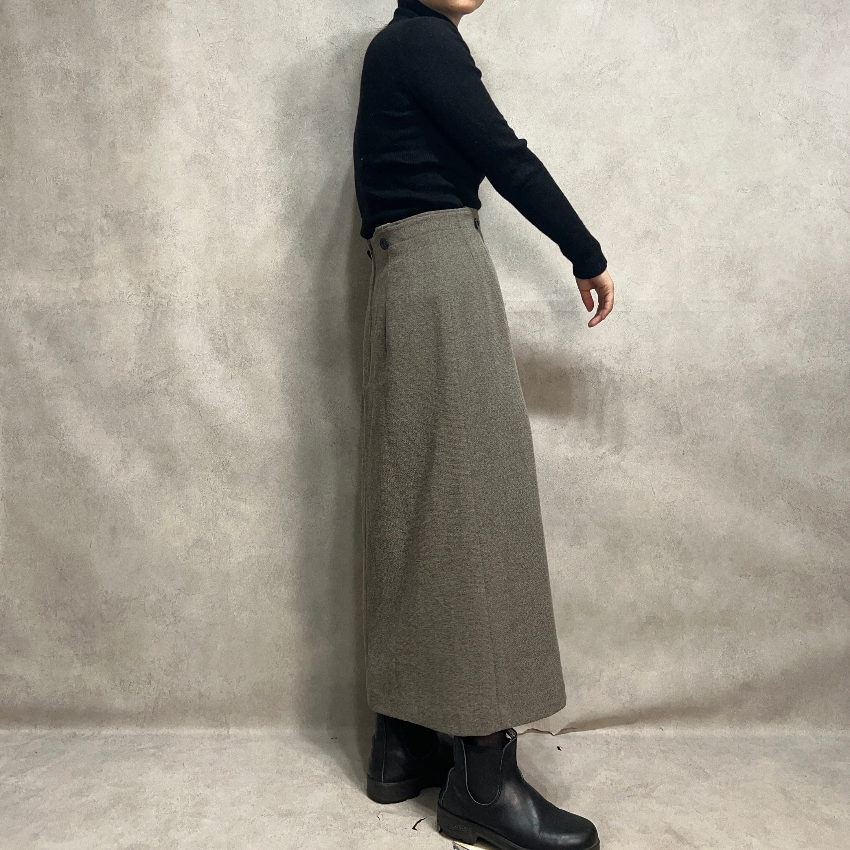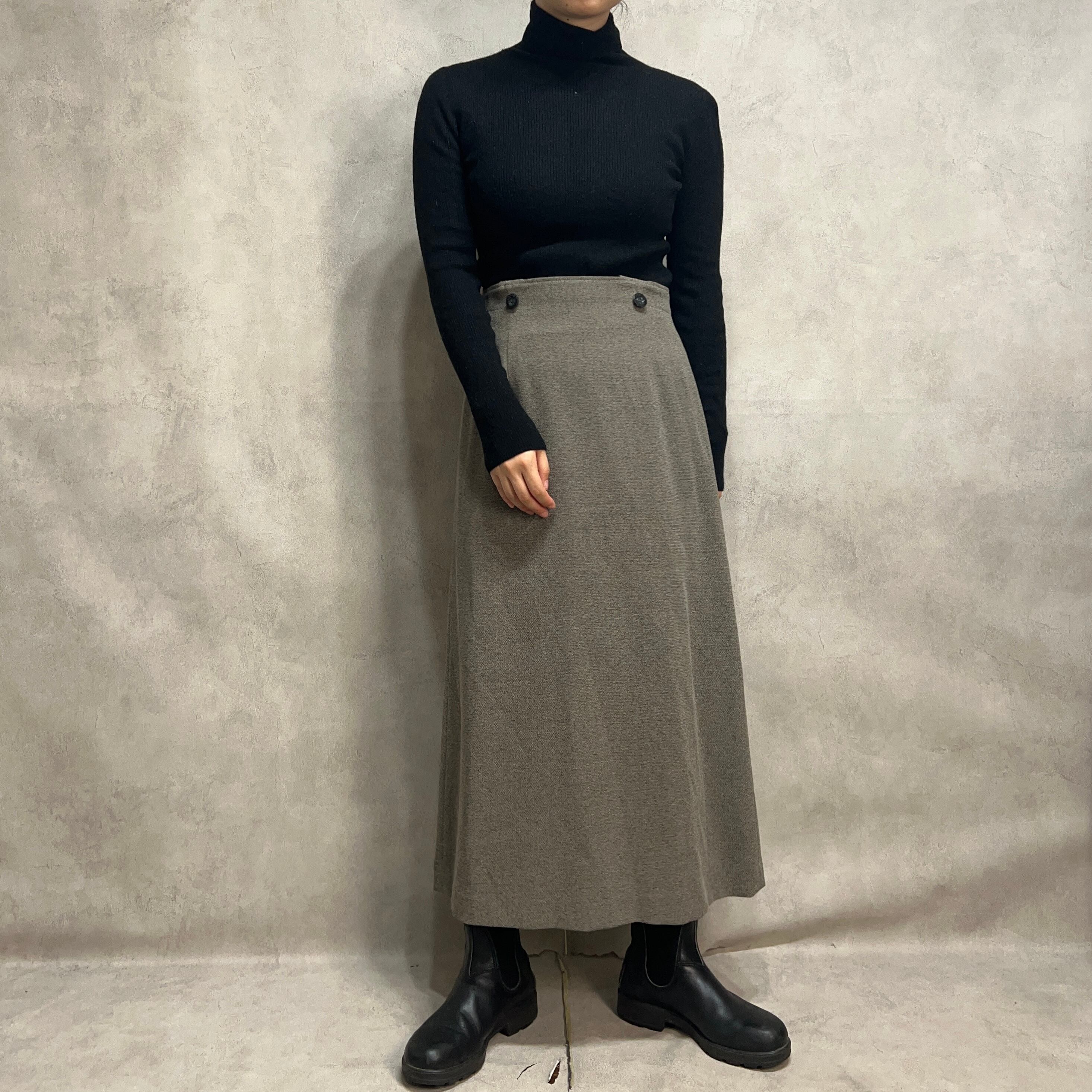 ビッグボタンが特徴的なストラップ付きスカート。ストラップを取り外して2wayで着用できます。トップス次第でヴィンテージ感のあるコーデにも綺麗めにもなります。