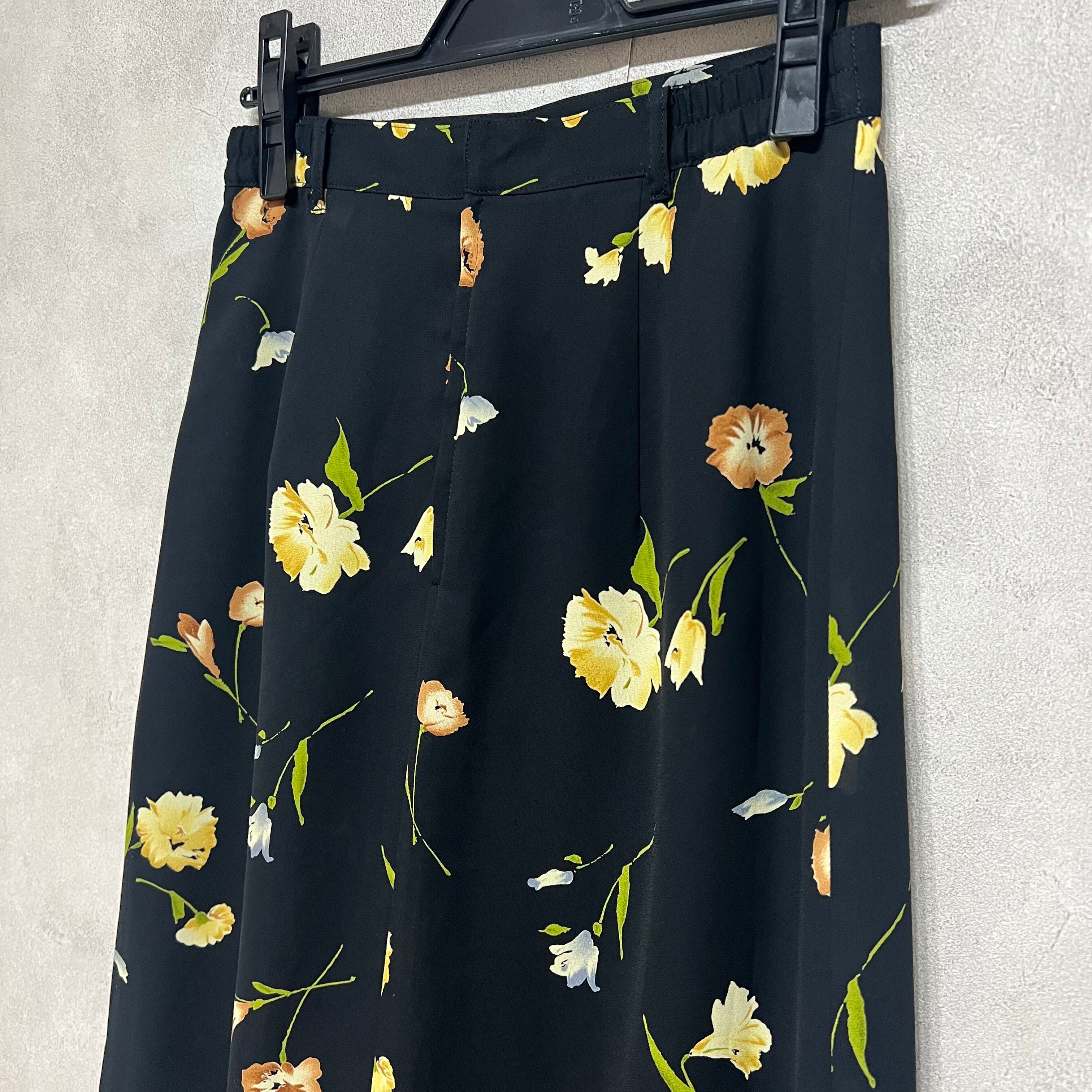 オレンジとイエローの花柄の配色がポイントとなって、ブラウンやグリーン、レッドなどの単色ニットとの相性も抜群です。ブラックのトップスでオールブラックの組み合わせも花柄が映えて可愛いと思います◎