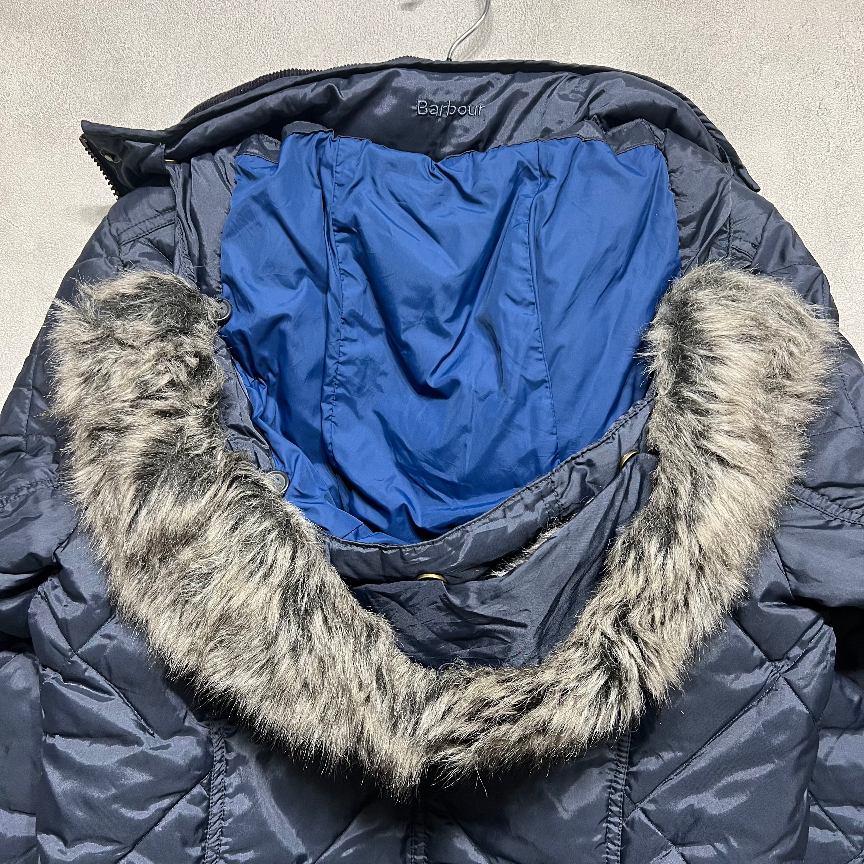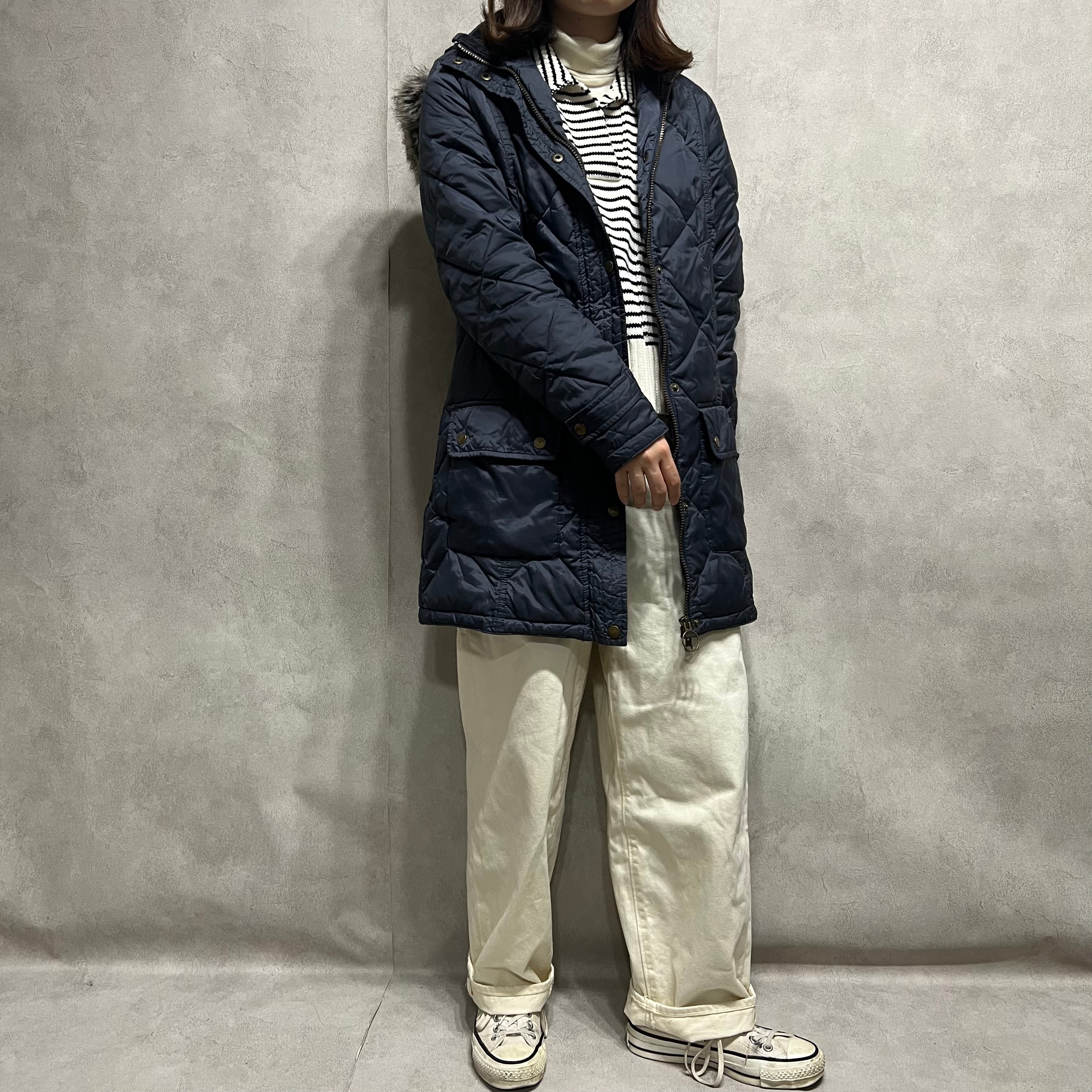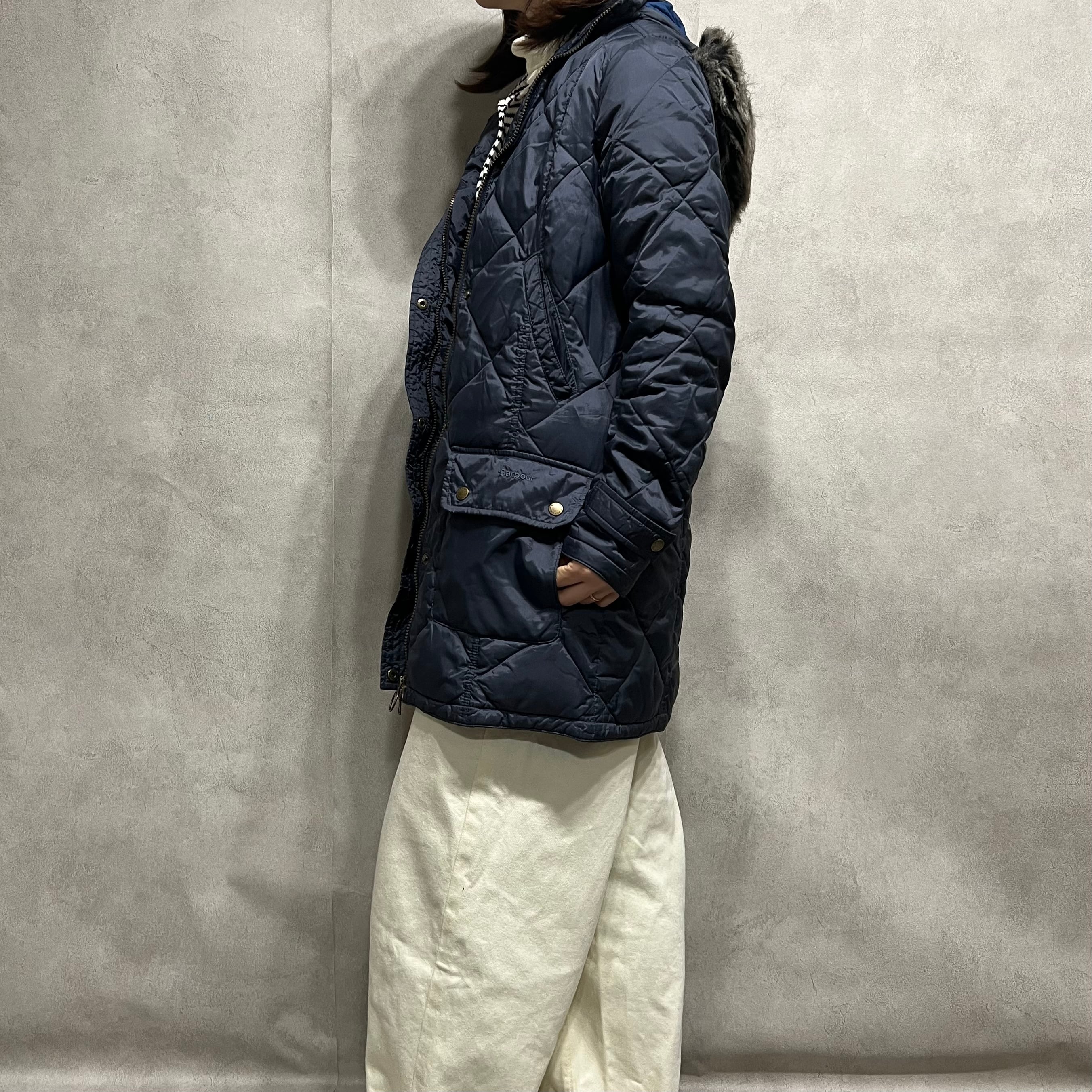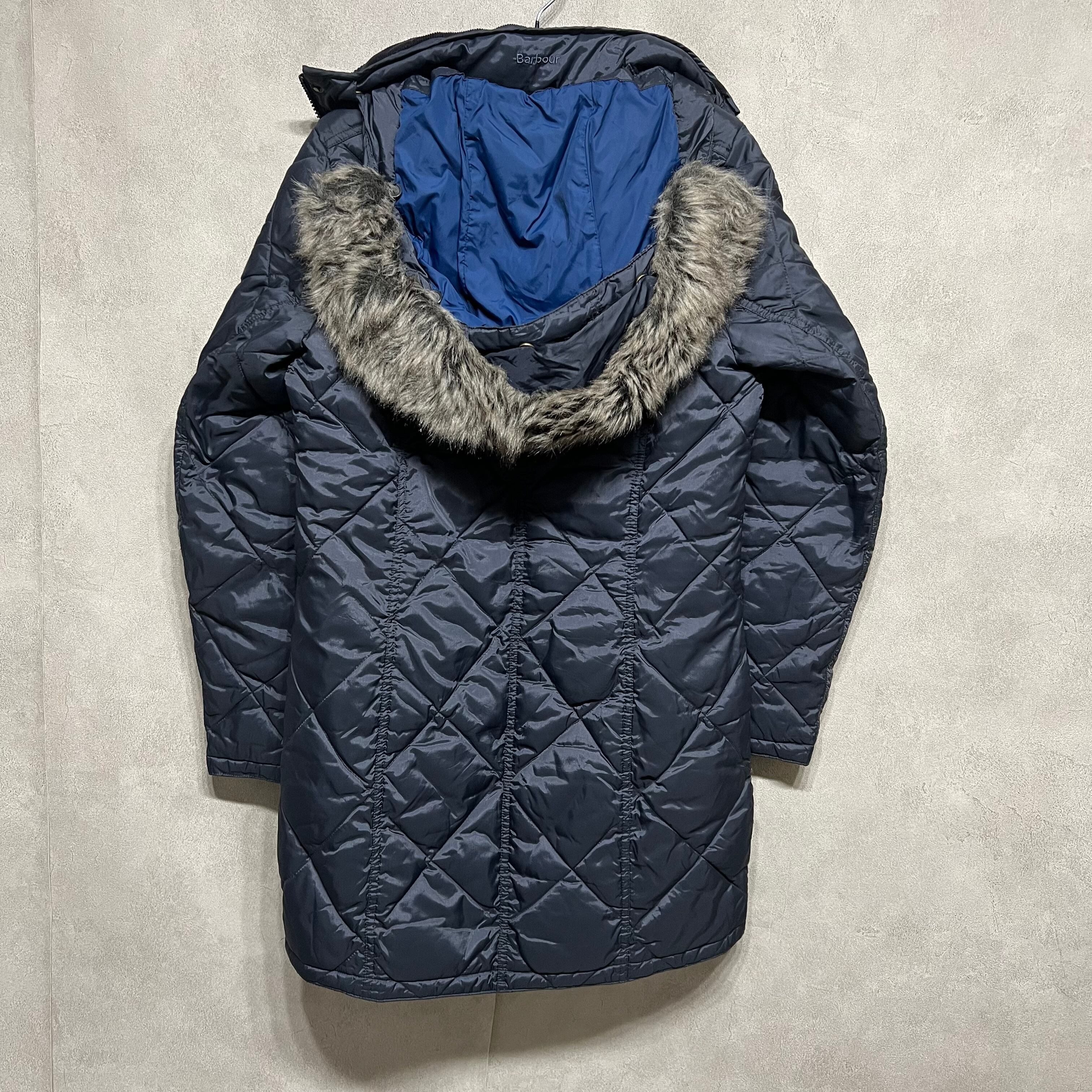 Barbour ファー付きキルティングダウンコート ネイビー アウター バブアー 古着 レディース メンズライク